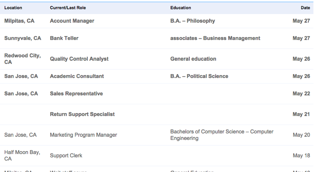In the tech world, this means submitting a great application AND getting a referral. That’s because recruiters are overwhelmed with me-too applications. When I led hiring for a VC-backed startup, this is what I’d see on Indeed’s backend: