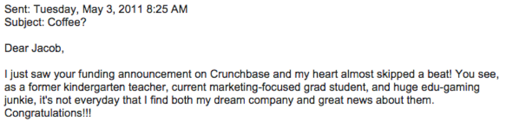 When even a hot company like Yelp loses billions of dollars in value in a single day(opens in a new tab) because they can’t hire people fast enough, finding a great job is just about broadening your horizons and putting yourself out there. Like this email to a newly-funded entrepreneur that netted me a coffee meeting that week: